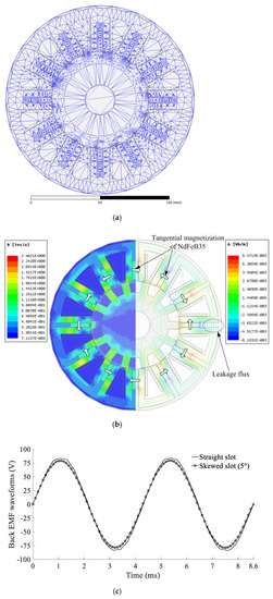 Based on the simulation model of Figure 6b, Figure 6c compares the back EMF waveforms of the FSPM machine with the straight-slot-type rotor and skewed-slot-type rotor (5 degree). It can be seen that the back EMF waveform of skewed-slot-type rotor is closer to sinusoidal than that of straight-slot-type rotor, but the back EMF waveform amplitude of the skewed-slot-type rotor is slightly smaller than that of the straight-slot-type rotor (79.5 and 82.9 V, respectively).