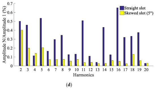 After normalization, Figure 6d shows the harmonics analysis of back EMF waveforms of straight-slot-type rotor and skewed-slot-type rotor (5 degree). From Figure 6d, it can be seen that the second, third, fifth, eleventh, fourteenth and sixteenth harmonics are very significant in the back EMF waveforms of the straight-slot-type rotor, and the second, third and fifth harmonics are the main components in the back EMF waveforms of skewed-slot-type rotor. In general, the total harmonic distortion (THD) of the back EMF waveforms of the FSPM machine with the skewed-slot-type rotor is 1.79%, which is less than that of the FSPM machine with the straight-slot-type rotor (5.6%).