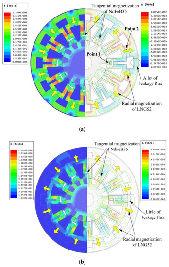 Simulation models of weaken flux and enhance flux. (a) Weaken flux model of VFMPM machine (magnetization of LNG52); (b) Enhance flux model of VFMPM machine (demagnetization of LNG52).