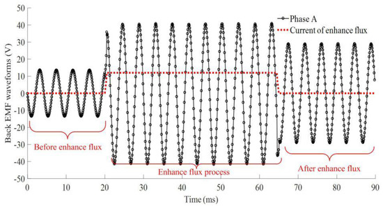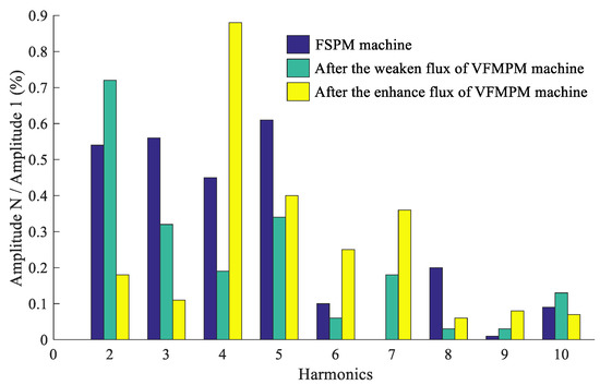 Moreover, the back EMF waveforms of the VFMPM machine under the weaken flux process are illustrated in Section 4 of this paper, and the harmonics comparison of the back EMF waveforms of Figure 8 (weaken flux condition and enhance flux condition) are illustrated in Reference [19].