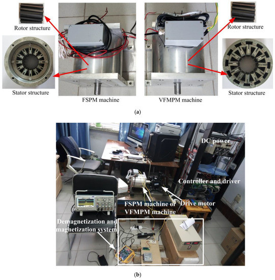 In order to verify the results of the theoretical analysis and simulation, two prototypes of the FSPM machine and VFMPM machine with the same main dimensions and skewed-slot-type rotor were manufactured, as shown in Figure 9a. The parameters are shown in Table 1. Figure 9b shows the test rig of the back EMF waveforms.
