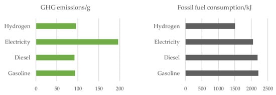 Indeed, the fuel or energy consumed onboard is the downstream process, which is the pump-to-wheel (PTW) cycle. On the other hand, fuel exploitation, refining, and power generation come from the upstream process, which is the well-to-pump cycle. Thus, WTP and PTW create the lifecycle view (i.e., well-to-wheel, WTW). Wang [9] et al. compared gasoline, methanol, and hydrogen as fuel options for FCEV from the well-to-wheel view, concluding that methanol reformation could be a promising fuel pathway for the hydrogen fuel cell vehicle. Li [10] et al. presented the assessment of battery and fuel cell vehicles using a WTW analysis. Using the current fuel pathways, Ref. [10] found that BEV emitted significant GHG emissions in the well-to-pump stage, leading to the worse GHG performance of BEV in operation mode C. Therefore, Li [10] et al. suggested cleaner hydrogen production pathways and cleaner electricity power generation. Gupta [11] et al. established the WTW cycle for heavy-duty vehicles, evaluated the 20% hydrogen and compressed natural gas mixture fuel engine, and suggested that a cleaner hydrogen feedstock was essential.