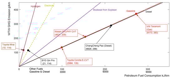 In Figure 2, there are two labels in the horizontal coordinate: the label with 3000/6000/9000 is used for gasoline and diesel fuel; the other labels (with 100/200/300 tricks) indicate hydrogen and electricity. The slope of these lines represents the dependency on petroleum fuel. A lower slope represents more dependency on petroleum fuel. The position of scatter points in the vertical coordinate represents the GHG emission performance. The higher they are towards an upright position, the worse the GHG emission performance. The Toyota Corolla shows the most energy efficiency among the three gasoline vehicles, as the Toyota Corolla occupies the lowest vertical position. Despite the WTW GHG emission of electricity being twice that of gasoline, the BYD Qin Pro has the best GHG emission performance, with 114 g/km. Since the overall onboard efficiency of BEV is much higher than that of the gasoline or diesel vehicle, most of the onboard energy of BEV can be used to drive the vehicle. Due to the poor efficiency of the ICE, only a tiny portion of one MJ of gasoline or diesel fuel can be used to drive the vehicle. Therefore, hydrogen fuel seems the most promising solution. First, the hydrogen fuel GHG performance is comparable with gasoline and diesel fuel, as shown in Table 1. Second, the fuel cell system’s onboard efficiency is high enough to fully utilize the potential of hydrogen fuel, such as in the even GHG emission performance of MIRAI and Qin Pro. Third, the hydrogen fuel’s consumption of petroleum fuel is lower than that of electricity. Figure 1 shows that the MIRAI petroleum fuel consumption is 10 kJ/km, while the BYD Qin Pro consumes 21 kJ/km. This lower consumption of petroleum fuel further relieves the petroleum fuel import.