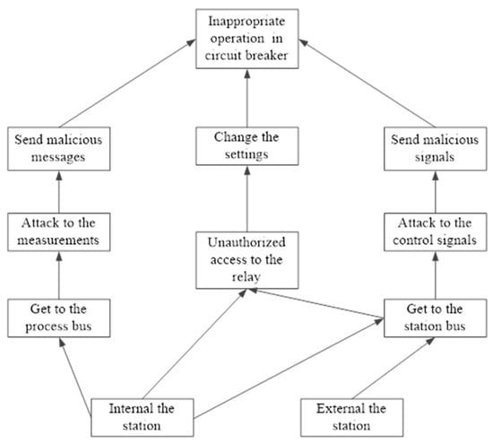 This communication protocol is used to organize the data transferred between IED’s across the Local Area Network (LAN) system. It is global standard to confirm the interoperability between the IEDs from serval vendors, and the main function of that standard is to break the core of the IEDs into several logical nodes. Each logic node presents a certain function of the physical device. IEC 61850 maps the data into three different protocols, and GOOSE that is fast and non-routable multicasts and transfers over layer 2 of the Open Systems Interconnection (OSI). It can be used for the critical operation in the power system such as protection of the power line. The main feature of the GOOSE message is to receive it within 4 ms from the publisher to trip the circuit breaker. Moreover, SMV is another protocol that is used in the real time operation to digitalize the voltage and current signals through the process bus between IEDs. IEC 61850 recommended to transfer the electrical signals in 80 sample/s for 60 HZ voltage and current signals. It follows a publisher and subscriber model and sends within 4 ms. Manufacture Message System (MMS) is the third protocol, and it can be used for control and optimization purposes as there is no time constant to send that message and follow a client and server model [19]. The major problem of IEC 61850 is the threats of attacks, some of those attacks can be shown in Figure 4.