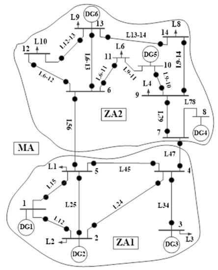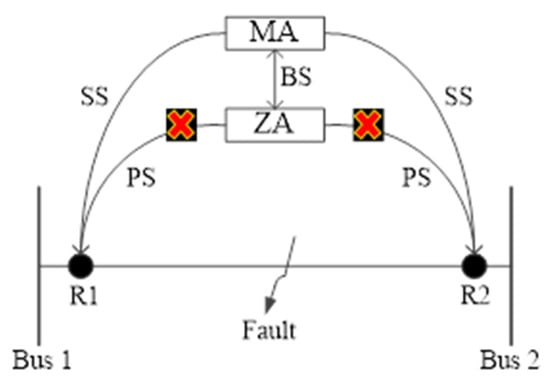 Figure 9 shows the case of cyber-attack of the GOOSE signals (Primary Signals (PS)) between ZA and the protective relays. ZA identified the fault but could not send the PS to the relays. In this case, MA communicated with ZA through buck up signals (BS), and the fault location was identified as MA was receiving the voltages of the buses. MA is operated as a secondary protection agent, and it sent GOOSE signals (Secondary Signals (SS)) to the corresponding relays as shown in Figure 9.