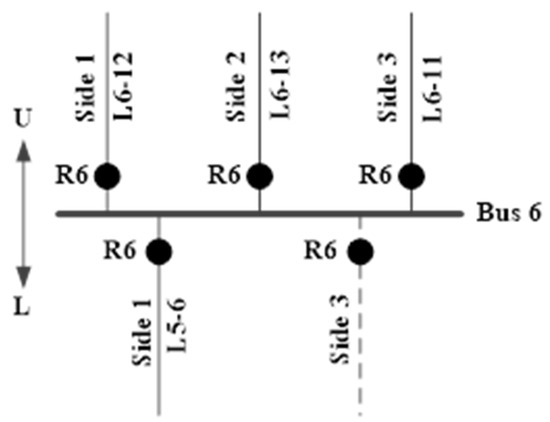 Figure 5 shows the proposed protection idea on IEEE 14- bus network (information about the system can be found in [16]). As it can be noted in this figure, the system is divided into two zones. The voltage of each bus is sent to the Main Agent (MA) and the agent of each zone 1 (ZA1) and the agent of zone 2 (ZA2). During the normal operation, the voltages are changed within the accepted nominal values, while the fault will cause dropping in the voltages of the corresponding buses and identify the fault location. In order to identify the fault location and the faulty transmission line and accordingly the protective relays that will operate to isolate the fault correctly, Figure 6 shows the transmission lines that are connected to bus 6. We identified the relays that are connected to bus 6 to be at two directions (Upper (U) and Lower (L)). For the upper direction, we have three relays identified by side (1) (the left side), the middle leg (2) and the right side (3). On the other hand, we have one transmission line in Figure 5 (L56) identified by R6 in side 1. We added another transmission line in Figure 6 and determined that the relay is located in side 3 as we need to certain side 2 to the middle leg. Assume that we have a fault at the transmission line between bus 6 and bus 12 (L6–12); based on that order, the relay should be operated to isolate the fault is R6 located in the upper direction and determined by side 1.