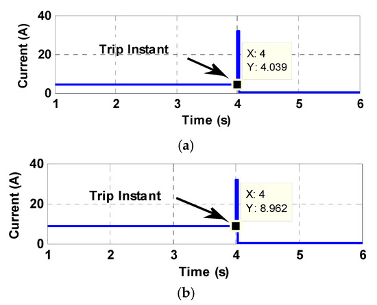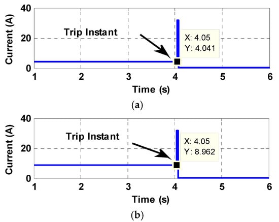 This case explains the occurrence of the fault in the transmission line that connected between buses 6 and 12. When the fault happens, the voltages of buses 6 and 12 drop and are sent to the ZA2 as SV messages. ZA2 identified the fault location, and according to the last explanation regarding the protective relays that should operate to isolate the fault, ZA2 sent GOOSE messages to the corresponding relays. Figure 8a showed that R6, located in the upper direction at side 1, is tripped at t = 4 s. In order to isolate the fault completely from the system, R12 in the lower direction and located at side 1 is tripped at t = 4 s as it can be shown in Figure 8b.