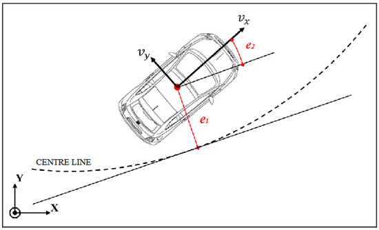 In order to implement an LKS, a dynamic model is considered. It is based on two additional state variables, expressed in terms of position and orientation errors with respect to the road reference system [34]. Thus, as shown in Figure 1, defining as the lateral displacement (the distance of the CoG of the vehicle from the center line of the lane) and as the relative yaw angle error concerning the road centerline (angle between the longitudinal velocity direction and the tangent to the center line), considering the road radius is large so that the small angle assumptions can be made and supposing that the road curvature is known from in-vehicle ADAS map and/or I2V communication, the desired yaw rate of the vehicle is defined as in [34] as