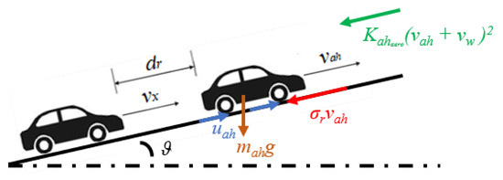 where ( is the maximum cross-area of the ahead vehicle and its drag coefficient) and is the ahead vehicle mass [34]. All these parameters are assumed to be known and transmitted through V2V to the ego-vehicle. Then, the states are added to the other state variables to define the complete ego-vehicle model, as detailed in the next section.