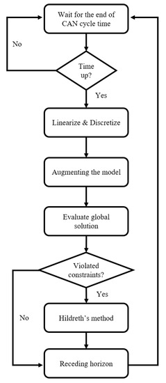 The overall flow chart for MPC implementation through model-based design approach and for MPC execution on a real MCU is shown in Figure 3. Thus, at each time step the control algorithm waits for a new CAN message containing updated vehicle and environmental data (i.e., reference speed from C-ITS and/or ADAS sensors, road curvature, vehicle speed, lateral displacement, yaw angle error and relative distance). Then, when new data are available, the algorithm at first executes linearization and discretization, then the linearized model is augmented and MPC evaluates the global solution. If constraints are not violated, then the receding horizon allows to update the wheels torque and the steering angle at the wheels at the current time step, and then the execution returns to wait for a new CAN message. If there is a violation on constraints, then Hildreth’s method is executed in order to find a sub-optimal solution. Thus, the receding horizon is applied. Eventually, the execution restart waiting for a new CAN message.