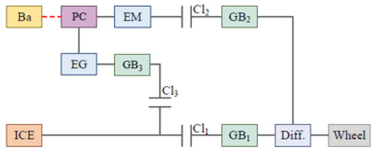 The vehicle investigated in this work presents a combined series-parallel powertrain composed of an ICE, two electric motor/generator units ( and ), a battery pack (), a power converter (), three clutches (, , and ), a differential () and three gear-boxes (, , and ). The powertrain schematic is depicted in Figure 4. Either series or parallel driving can be activated, depending on the clutches position. Battery charging can be realized though engaging . Possible driving modes and the corresponding engagement/disengagement of the clutches are summarized in Table 2. The presence of three clutches, on one side, complicates powertrain control, but, on the other side, avoids loadless operation when a unit is not used, reducing friction losses.