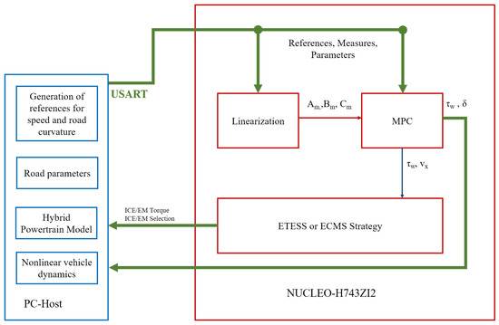 The contribution of this work is twofold and aims at developing an integration strategy that allows running both motion and powertrain control in real-time on a single MCU. First, the MPC strategy proposed in this work controls both the lateral and longitudinal dynamics of a vehicle, considering a simplified single-track model, and it was assumed that not only the motion references for the vehicle and constraints on the speed, but also some of the model parameters that depend on the road conditions, e.g., friction, slope and curvature, would be received from the smart road infrastructure through a C-ITS service. The controller had two outputs, the steering angle of the wheels and the torque request for the powertrain. The torque request was handled by the EMS through the ETESS proposed by the authors in previous works [5,6]. The ETESS aims at minimizing the HEV fuel consumption, and it requires a reduced computational effort with respect to existing strategies (i.e., ECMS) such that it can run on the same control unit of the MPC. This particular implementation was the second main contribution, since for the first time, a vehicle dynamics control algorithm and a powertrain management strategy were demonstrated to run in real time on the same embedded control unit.