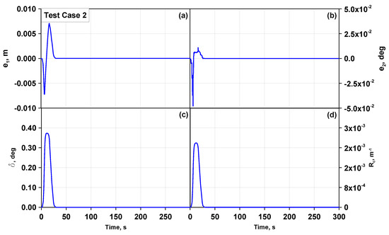 - The steering angles of the front wheels are equal to and the small angle approximation is used [34], considering that the control range on the steering angle at the wheels is [−5, 5]°; thus, and ;