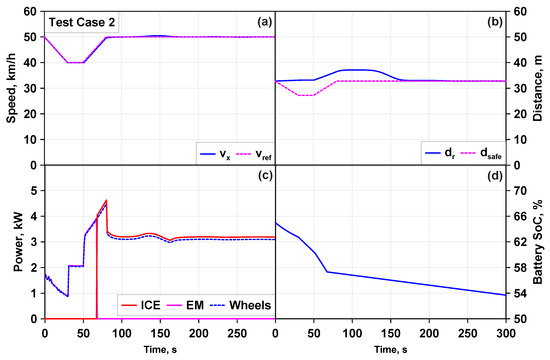 In this work, a Smart Road has been simulated in order to provide the ahead vehicle with point-to-point speeds (i.e., ISA), wind velocity, road friction, road slope and air density. V2V communication has also been simulated for car-following data exchange (e.g., ahead vehicle information such as speed, mass, acceleration). This allowed us to test, very efficiently (PIL on inexpensive development boards), both motion and powertrain controls, considering two test scenarios based on a simple car-following (see Figure 9, Figure 10 and Figure 11): one in the longitudinal direction only, involving the C-ITS service ISA and the ADAS functionalities EEB and ACC; another one in both longitudinal and lateral directions, involving road curvature, LKS and ACC. The results showed good tracking properties of the MPC in terms of reference speed, safety distance and lane keeping.