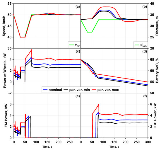 Sensitivity test (blue: nominal case (m), dashed red: maximum case (), dashed black: minimum case ()) with parametric variations on vehicle mass—(a) speed (km/h); (b) relative distance (m); (c) wheels power (kW); (d) battery SoC (%); (e) EM power (kW); (f) ICE power (kW).