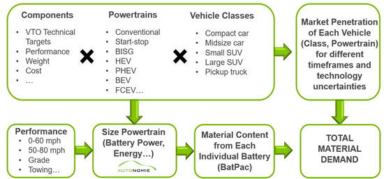 Figure 1 shows the detailed steps of the large-scale simulation process used to quantify the battery material demand using Autonomie and BatPaC.