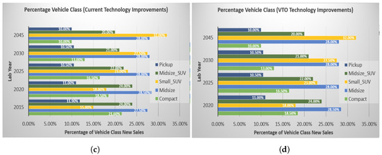 Market penetration assumptions of electrified powertrains and vehicle classes: (a) penetration of electrified powertrains with current technology improvements; (b) penetration of electrified powertrains with VTO technology targets; (c) penetration of vehicle class with current technology improvements; and (d) penetration of vehicle class with VTO technology targets.