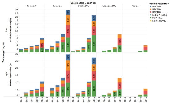 Figure 4 details the market penetration across the different electrified powertrains and vehicle classes for the different analysis years and technology progresses.