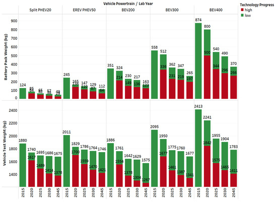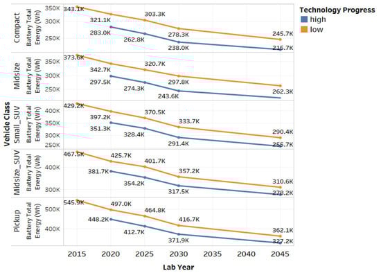 Figure 7 shows the impact of the sum of the total battery energy for the different electrified powertrains and vehicle classes modeled. The analysis is shown across the different laboratory years and technology progresses.