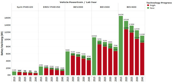 We observed that the battery total energy requirement decreases significantly over time. For PHEVs, the battery pack total energy decreases by 33–50% for the 2045 laboratory year compared to the 2015 laboratory year. For BEV200s, the battery pack total energy decreases by 57% for 2045 laboratory year compared to the 2015 laboratory year. The decrease for the BEV400s approaches an 80% reduction in total battery pack energy. For high-range BEVs, the reduction is much greater due to the combined effects of advances in vehicle technology. The explanation for such observation is that, as different vehicle components improve over time, the different performance requirements (EV range, etc.) results in lower component sizes (battery energy, etc.).