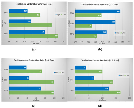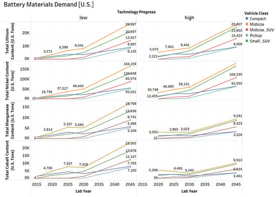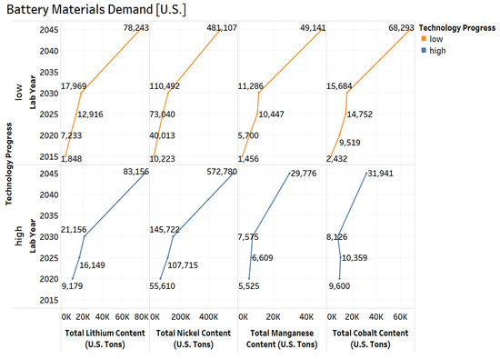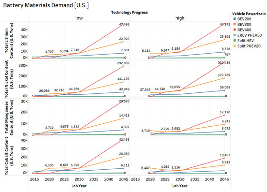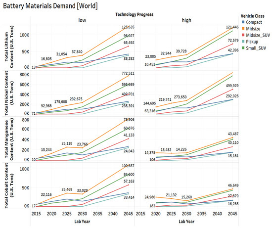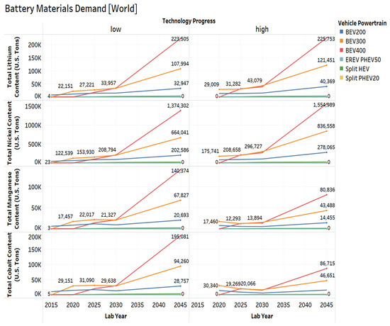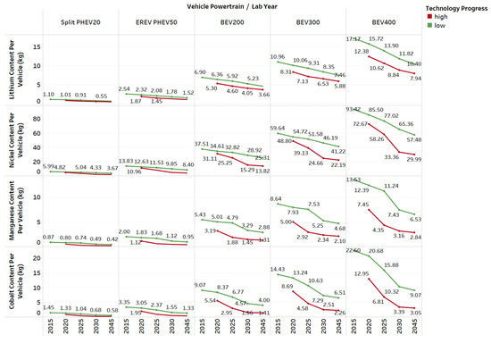 - Accounting for the market penetration of different battery chemistries and electrified vehicles, the total lithium content requirement is expected to increase by a factor of 42 by 2045 for low technology progress and 45 for high technology progress. The total nickel content requirement is expected to increase by a factor of 47 for low technology progress and 56 for high technology progress. The total manganese content requirement is expected to increase by a factor of 34 for low technology progress and 20 for high technology progress. The total cobalt content requirement is expected to increase by a factor of 28 for low technology progress and by 13 for high technology progress in both U.S. and global market.