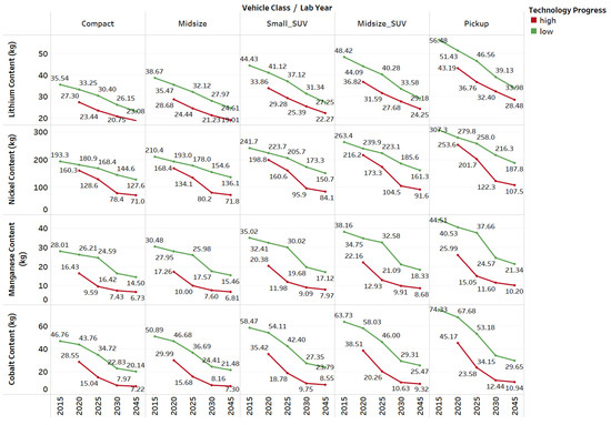 Figure 9 illustrates the sum of different battery material contents across the different vehicle classes. It shows that similar effects are also observed when performing the analysis across vehicle classes.