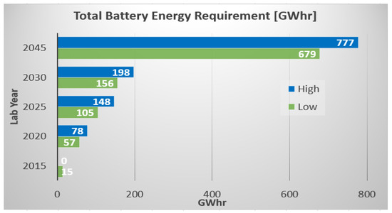 Figure 11 illustrates the total battery energy requirement across the different years using our market penetration assumptions.
