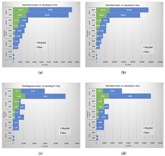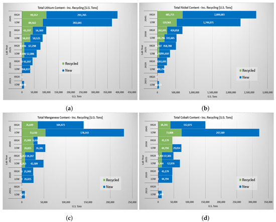 Global battery materials demand (in U.S. tons) for different laboratory years (including recycling): (a) total lithium; (b) total nickel; (c) total manganese; and (d) total cobalt.