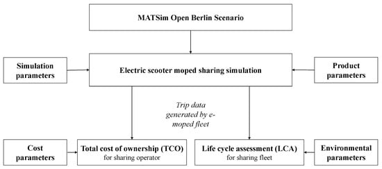 The baseline data originate from a scenario of the multi-agent transport simulation framework MATSim [23]. As indicated in Figure 1, it serves as input for the sharing simulation generating the traffic data of the shared e-moped fleet. The results are then used for the TCO and life cycle assessment (LCA).