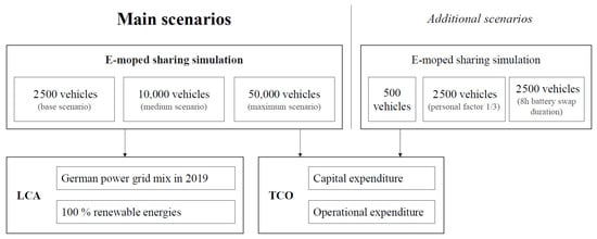 Regarding the electric energy used for charging the e-mopeds over these five years, the German electricity mix of the year 2019 is applied. Due to various laws and decisions, such as the nuclear power plant or coal phase-out, more renewable energies will be used in the coming years [39]. To reflect this influence on the environmental balance, LCAs of all main scenarios based on a power grid mix consisting exclusively of renewable energies are carried out. As Figure 3 indicates, three additional cases are investigated for the main scenarios. In the first additional scenario, a simulation with a fleet size of 500 vehicles is analyzed to mirror a stricter e-moped sharing regulation scheme in Berlin and/or a lack of user interest in this kind of service. Cases two and three exhibit the same fleet size as the base scenario, but investigate two different parameters. For additional scenario two, a personal factor is integrated. This factor aims to reflect the personal preference of the agents toward using this type of sharing system, due to various reasons, such as security concerns, lack of comfort or spatial requirements, or a financial unwillingness to pay for such services. The value is set to 1/3, which means that every third trip of all trips suitable for e-mopeds can be potentially substituted by an agent. The third case explores the traffic effects of a service operator who assigns low priority to the availability of the e-mopeds. This is reflected by a longer battery swapping duration, which is set to eight hours in comparison to 60 min, based on the scenario with 2500 vehicles.