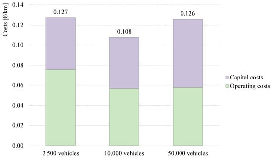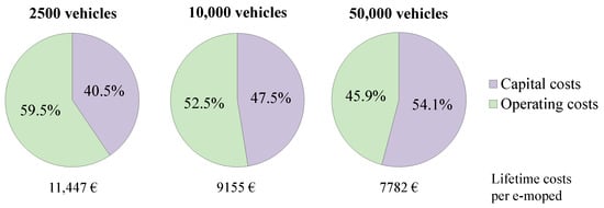 Figure 4 exhibits the share of the lifetime capital and operative costs for the e-moped fleets of the main scenarios. As discussed in the TCO part of Section 3, it highlights that the bigger the fleet size, the higher the share of capital costs based on the total costs. Here, the capital cost shares rise from 40.5% (base scenario) over 47.5% (medium scenario) to 54.1% (maximum scenario). Breaking down the total lifetime costs on the actual number of e-mopeds used in the fleet, the biggest fleet size offers the lowest value with EUR 7782, compared to EUR 9155 for 10,000 vehicles and EUR 11,447 for 2500 vehicles (Figure 4).