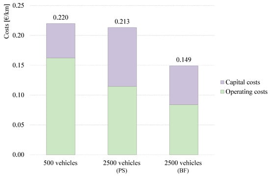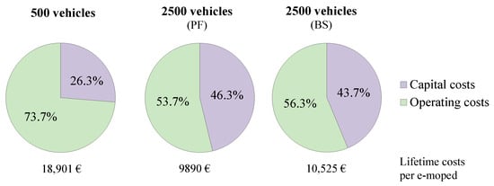 Figure 6 exhibits the share of the lifetime capital and operative costs for the e-moped fleets of the additional scenarios. In the 500 vehicle scenario, 26.3% of the lifetime costs per e-moped are related to the one-time expenses of the capital costs. This is lower than in the other two scenarios. The share of the operating costs are 56.3% in scenario with 8 h battery swap duration and 53.7% in the base scenario with personal. Regarding the lifetime costs per e-moped, the scenario with the smallest fleet size offers the highest value with EUR 18,901, compared to EUR 9890 for the personal factor scenario and EUR 10,525 for the 8 h battery swap scenario.
