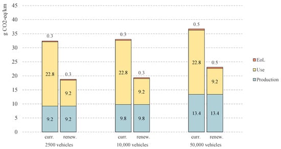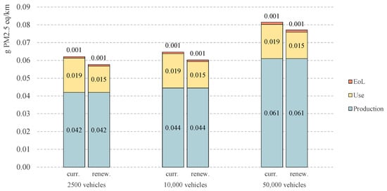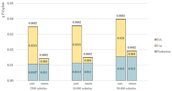 The PMFP results are displayed in Figure 11. A fleet consisting of 2500 vehicles emits 0.062 g PM2.5 eq/km for the German power grid mix of 2019, which grows by 4.1% to 0.064 g PM2.5 eq/km for 10,000 vehicles and by 31.2% to 0.081 g PM2.5 eq/km for 50,000 vehicles. For all scenarios, the production phase is the major contributor, being about two to four times larger than all other emissions combined. With renewable energy as an electricity source, the total emissions in particulate matter decrease to 0.058 g PM2.5 eq/km (base scenario), to 0.060 g PM2.5 eq/km (medium scenario) and to 0.077 g PM2.5 eq/km (maximum scenario).