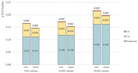 As highlighted in Figure 9, the emissions regarding the AP for the base scenario with 2500 e-mopeds charged with the current electricity mix are 0.166 g SO2-eq/km. It shows an increase of approximately 4.0% (10,000) to 30.8% (50,000). In comparison to the results based on an electricity generation of 100% renewable energies, the overall sulfur dioxide equivalent emissions are between 8.9% and 11.6% lower. In all scenarios, most emissions are extruded during the production phase.