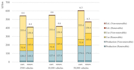 The CED is presented in the form of the distance-based required primary energy. According to Figure 12, the major contributor is the use phase amounting to 67.3% (50,000 e-mopeds) and to 74.9% (2500), given the current electricity mix. The fleet of the base scenario consumes 543.6 kJ/km, which grows by 11.3% to 605.3 kJ/km for the maximum scenario. Changing the energy source to 100% renewables, the energy required for the use phase decreases by 32.2% for every main scenario. The primary energy for the production and EoL remain constant.