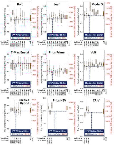 Additional data provided in Figure 1 include the number of trips in the data sample for each vehicle, which is shown between brackets below the vehicle ID on the horizontal axis, as well as equivalent EPA widow-sticker kWh/mile or gal/mile value for the combined cycle (as obtained from [7]), which is marked via a horizontal dashed line. The secondary vertical axis in Figure 1 (with red text) showcases the relative difference in trip energy intensity when referenced to the OBD average value for all trips by all vehicle samples of a vehicle model.