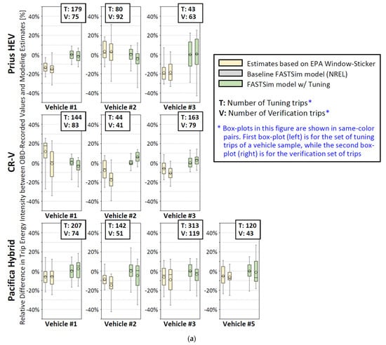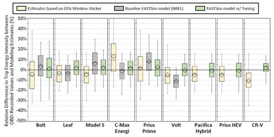 One of the key philosophies in the development of FASTSim by its original authors at NREL was to emphasize reasonable accuracy (within ±10% per [14]) in favor of fast computations that allow the simulation of large sets of real-world driving. In that sense, the key advantage of “baseline” FASTSim may not so much be its ability to provide better predictions than window-sticker ratings (which are also in the same ball-park of ±10% when examining averages across multiple vehicle owners in Figure 1), but in its ability to provide predictions about vehicle designs that do not exist in the market yet. For example, FASTSim could simulate a 150-mile electric range version of C-Max or change the powertrain of a conventional ICE pickup truck model into a 300-mile range BEV. For that reason, the validity assessment of fuel economy models in this section will examine the statistical distribution (via box plots) for the relative difference in trip energy intensity (per Equation (1)) for three predictors: