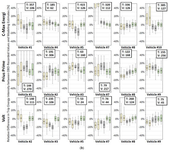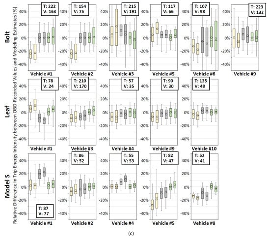 Figure 2. (a) Individual vehicle samples (Prius HEV, CR-V, Pacifica Hybrid) validity assessment of trip energy intensity. (b) Individual vehicle samples (C-Max Energi, Prius Prime, Volt) validity assessment of trip energy intensity. (c) Individual vehicle samples (Bolt, Leaf, Model S) validity assessment of trip energy intensity.