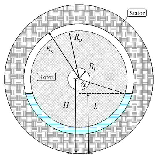 When the rotor is partly soaked in the cooling oil, the oil-soaked depth is assumed to be h, as shown in Figure 1. The air gap coefficient and end face coefficient are used to consider the effect of partial oil immersion, which are obtained by Equation (15):