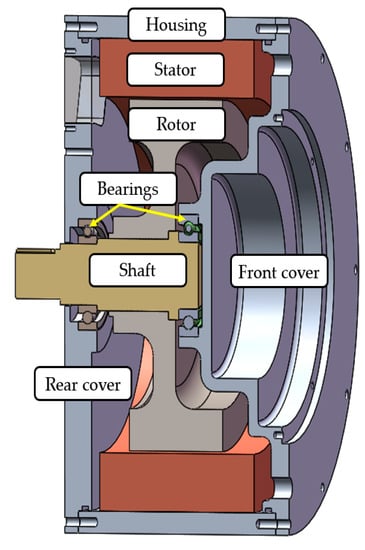 A three-dimensional geometric model of a 200kW hub motor was established, as shown in Figure 2. The structural components include stator, rotor, shaft, housing, and covers. To save the calculation cost, the stator with windings was simplified into a regular cylinder. Since this motor was a surface PMSM, the pole arc coefficient was 0.972, close to 1, and the permanent magnet was fixed radial by 0.8 mm thick carbon fiber circular sheath, fluid disturbance caused by circumferential clearance between each pole could be ignored. In such condition, the permanent magnet, rotor, and sheath were combined together.