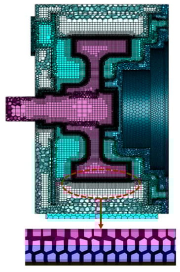 The internal space of the motor was extracted into a fluid domain, as shown in Figure 3, which includes cooling oil and air. Poly-hexahedron elements were employed to create a 3D mesh with a minimum size set at 1 mm, as shown in Figure 4, the number of volume cells is 4.85 million, and the maximum skewness is less than 0.57, which indicates that the element quality is fine.