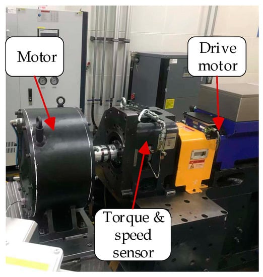 To verify the effectiveness of the improved analytical formula in Section 2.1 and the accuracy of the VOF numerical model established in Section 2.2, which takes the mixing effect of oil and air into account, a testing of oil friction loss was designed, as shown in Figure 5. The measuring cup was used to accurately take a certain amount of oil. The drive motor was used to change the rotation speed, which can allow the shaft to rotate at up to 12,000 rpm. The torque and speed sensor were used to test the mechanical loss of the motor with or without oil inside. All the measurements are carried out in an open circuit.