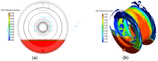 Six hours later, the simulation was done. Figure 6 shows the oil distribution at oil-soaked depth h = 0.1125 m. Figure 6a shows the oil distribution when the rotor is still, and Figure 6b shows the oil distribution when the damping torque generated by oil stirring is stable at rotation speed n = 1000 rpm. It can be seen that the oil rotates with rotor, and some oil is thrown up and splashed to the end of the stator winding.