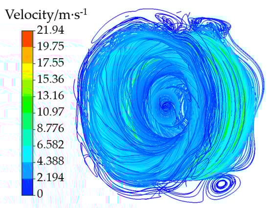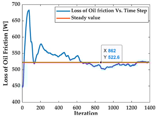 Figure 7 shows the velocity field of oil inside the motor when the flow state of oil gets steady at rotation speed n = 1000 rpm and oil-soaked depth h = 0.1125 m. It can be seen that the velocity of the oil close to the wall is 0, and the oil in the rotor rotation region has the maximum velocity and moves together with the rotor, which indicates the applicability of the VOF model for solving such problems. After 1400 iterations, the loss of oil friction gradually converges to 522.6 W, as shown in Figure 8.