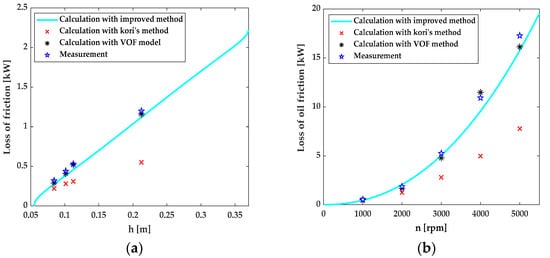 Comparison between the calculation with three methods and testing values of the oil friction loss: (a) relationship between oil friction loss and the oil-soaked depth h; (b) relationship between oil friction loss and the rotation speed n.