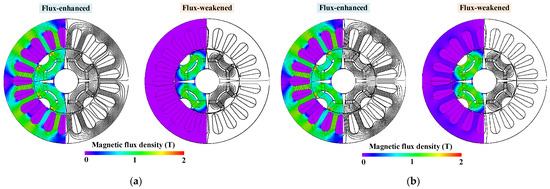 In the finite element simulation, the flux regulation ability is normally reflected by the air-gap flux density. However, in the actual testing process, since the motor’s air-gap flux density cannot be measured directly, it is usually characterized by the no-load back EMF amplitude of the machine under different MSs.
