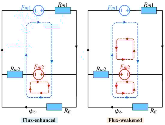 In order to qualitatively reflect the possible effects of the PM arrangements on the flux adjusting range, a simplified equivalent magnetic circuit of PHMMM is established as shown in