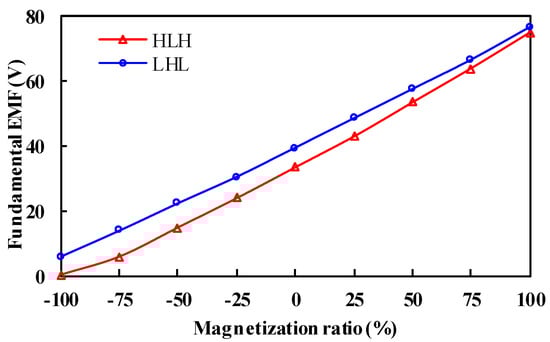 Figure 5. Moreover, the fundamental back EMFs, as functions of the magnetization ratio of LCF PMs, are shown in