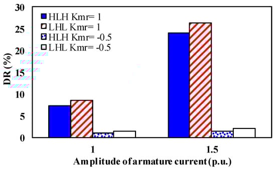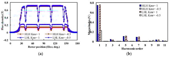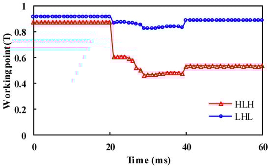 The demagnetization ratios of the LHL structure under different armature currents when Kmr = 1 are higher than those of the HLH structure. Moreover, the unintentional demagnetization will aggravate with larger current amplitude. In addition, both two structures show a small cross-coupling demagnetization ratio under the “Kmr = −0.5” state. This is because the HCF PMs are short-circuited by LCF PMs, leading to a flux loop formed within the rotor core. In this case, the HCF PMs can stabilize the working points of the LCF PMs in turn. It can be summarized that the LHL structure turns out to be more susceptible to the armature reaction, which shows a lower undesired demagnetization withstand capability.
