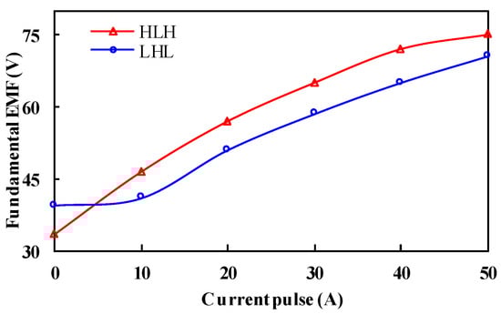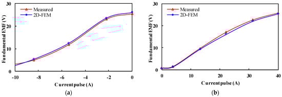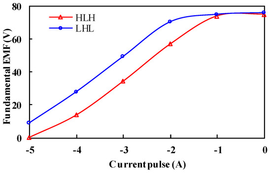 Figure 22 shows the phase fundamental EMF of the manufactured PHMMM with the applied d-axis demagnetizing and remagnetizing current pulses that have been measured and compared with FE-predicted ones. As expected, the 2D-FEM results are consistent with the experimental results. It can be observed that the HLH PHMMM shows a wide flux adjusting range, which confirms the foregoing FEM analyses.